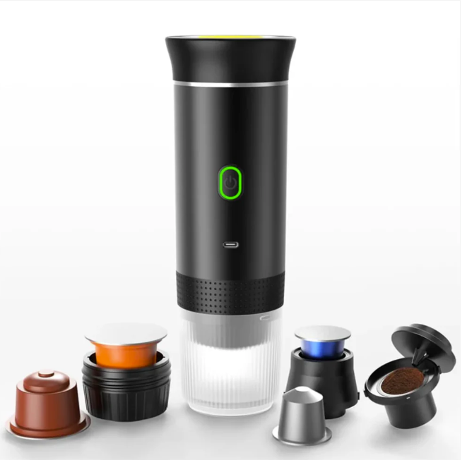 Nuestra cafetera portátil une diseño, funcionalidad y compatibilidad con cápsulas grandes, pequeñas y café molido. Ideal para adaptarse a tu rutina y disfrutar de tu café favorito en cualquier lugar y momento.